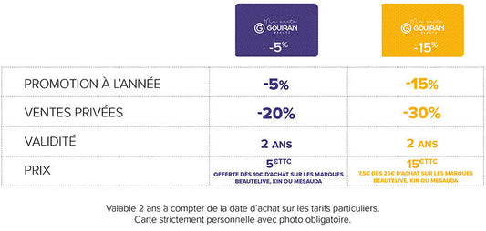 Gouiran Beauté vous propose 2 offres : Bénéficiez de 5% de remise sur tous vos achats pendant 2 ans pour 5€ TTC* ou de 15% de remise pour 15€ TTC*.